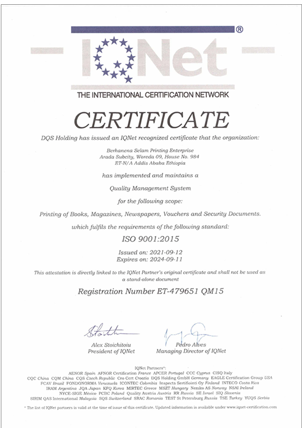 ከ2009 እ.ኤ.አ ጀምሮ የISO 9001:2015 የጥራት ሥራ አመራር ስርዓት ሰርቲፊኬቱ ባለቤት መሆን የቻለው ብርሃንና ሰላም ማተሚያ ድርጅት ስርዓቱን መተግበርና ማስቀጠል በመቻሉ አሁንም ተሸላሚ መሆኑን የጥራት ስራ አመራርና ማረጋገጫ ቡድን መሪ አቶ ኪዳኑ ነጋሽ ገልፀዋል፡፡